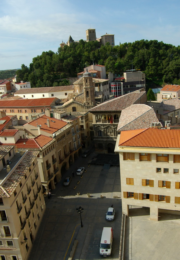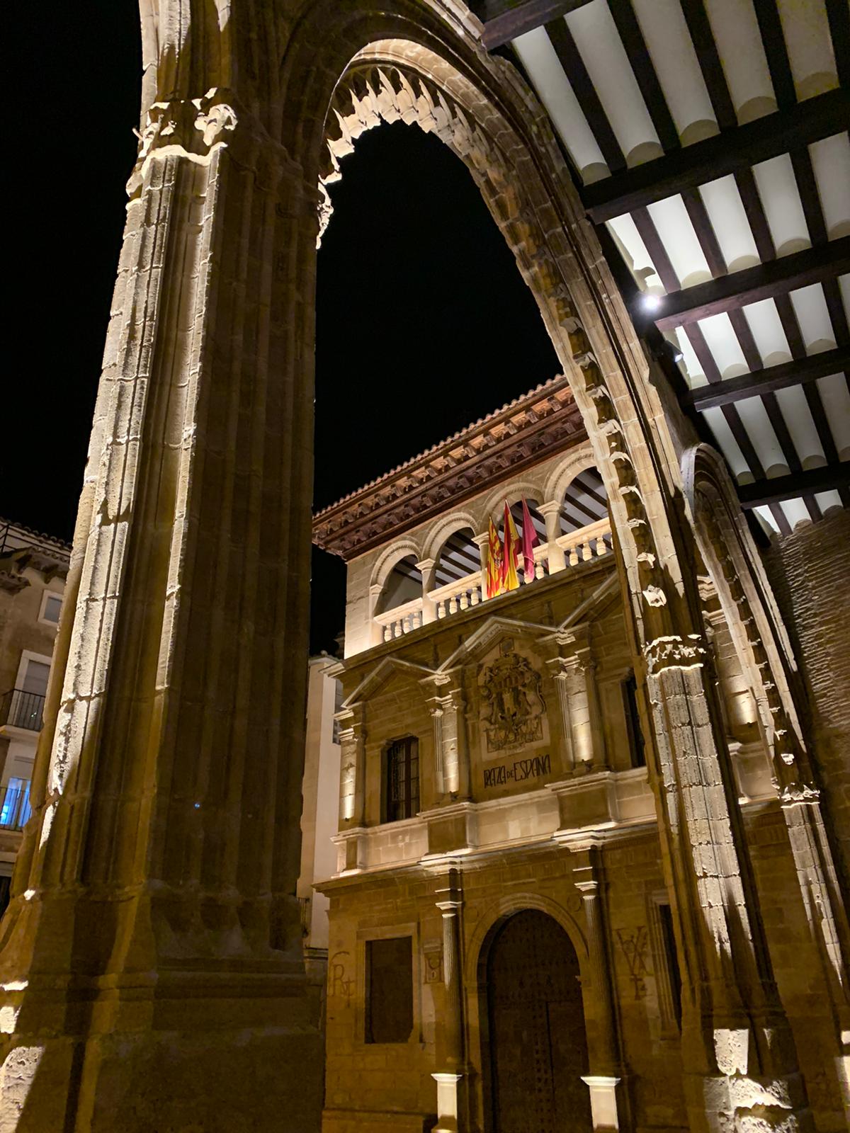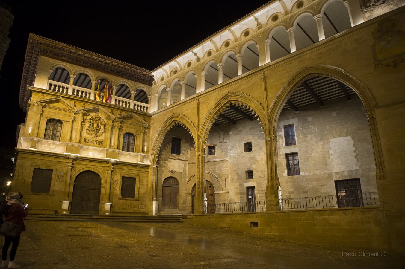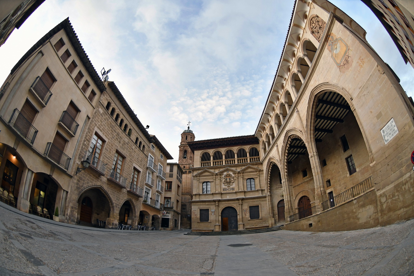 En el auténtico corazón de la ciudad, en la plaza de España, se alza su monumental casa consistorial, uno de los más bellos ejemplos de arquitectura renacentista aragonesa. Sus obras se llevaron a cabo, básicamente, entre 1567 y 1570. Se construyó como casa del Concejo, asociada a las diversas funciones que los gobiernos municipales ejercían: políticas, de representación y administrativas. Su fachada principal es una magnífica obra clasicista, llena de equilibrio y armonía, realizada en piedra sillar. Tiene una distribución clara y racional, estructurada en tres zonas horizontales o cuerpos, y en tres verticales o calles. En la planta principal o noble se disponen tres vanos rematados por frontones triangulares con piramidones en sus extremos. El central está cegado por el gran escudo de Alcañiz (añadido en 1742). En el tercer piso se desarrolla la típica galería aragonesa, definida por una sucesión de arcos que, en este caso, se apoyan sobre airosas columnas que confieren al conjunto mayor elegancia. Todo este conjunto está rematado por un gran alero de madera con dos líneas de ménsulas y decorado con ovas, acantos y casetones con motivos pinjantes. Su fachada lateral presenta elementos de tradición mudéjar: uso del ladrillo y decoración de bandas en esquinilla. En el siglo XVIII se llevó a cabo una profunda reforma del interior de este edificio. En su salón de sesiones se conservan dos magníficos fragmentos de pintura mural procedentes de la torre del Homenaje del Castillo. En uno de ellos se representa el tema clásico de La Rueda de la Fortuna, con su clara alusión al paso del tiempo y al destino.