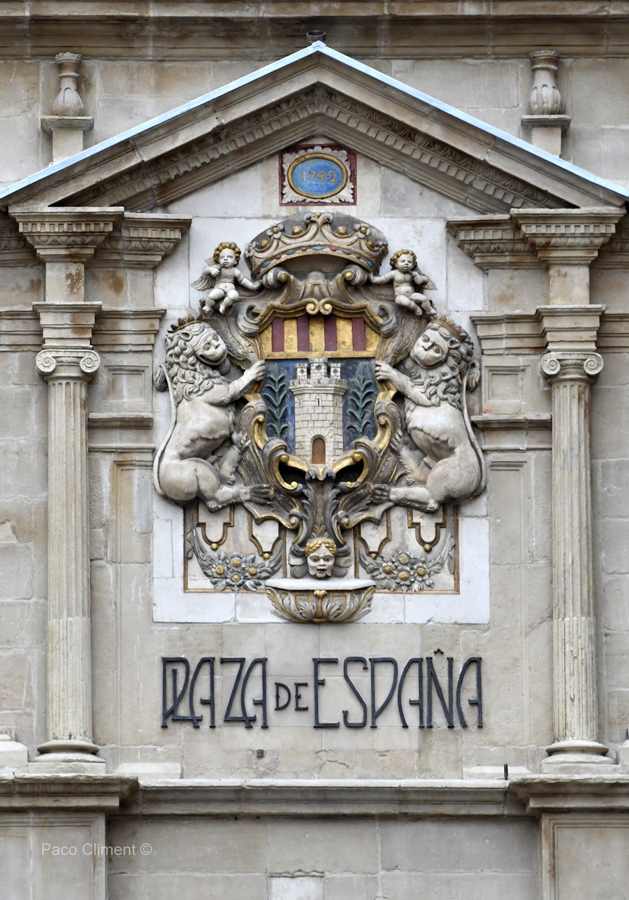 En estas casas era donde los Jurados tenian su Consistorio, y del que provino llamarsen Consistoriales: de ordinario asistian todos los dias tres horas por la mañana, y si habia algun negocio grave, tambien por la tarde. En ellas tenian un precioso archivo, por los documentos que contenia; y ademas se custodiaban en la misma, los enseres y jocalias que el Consejo tenia. Al lado de ellas estaba el granero del trigo, para el abasto publico; (y ahora sirve para el trigo del Posito): junto ó contiguo á este, se hallaba la Corte ó Tribunal del Justicia; a su lado estaba la puerta por donde se entraba y subia a las carceles; y al finar estas un poco mas alla se conserva /todavía la casa que era la Cambra, y en donde estaban los pesos y medidas. En la Lonja ó hermoso cubierto donde se halla todo esto que se deja referido, habia tambien entre la puerta de la carcel, y la de la Cambra, un grande mostrador de piedra labrada, con gruesos yerros fixos en la pared, para colgar en ellos los pesos de todos los tamaños; y en este parage era donde se obligaba á vender todas las mercancias, que de otras partes trahian á esta población: el qual permanecio en la forma indicada, hasta el año 1822, que lo mandó quitar un Alcalde de infausta memoria.