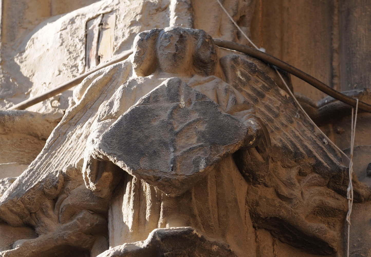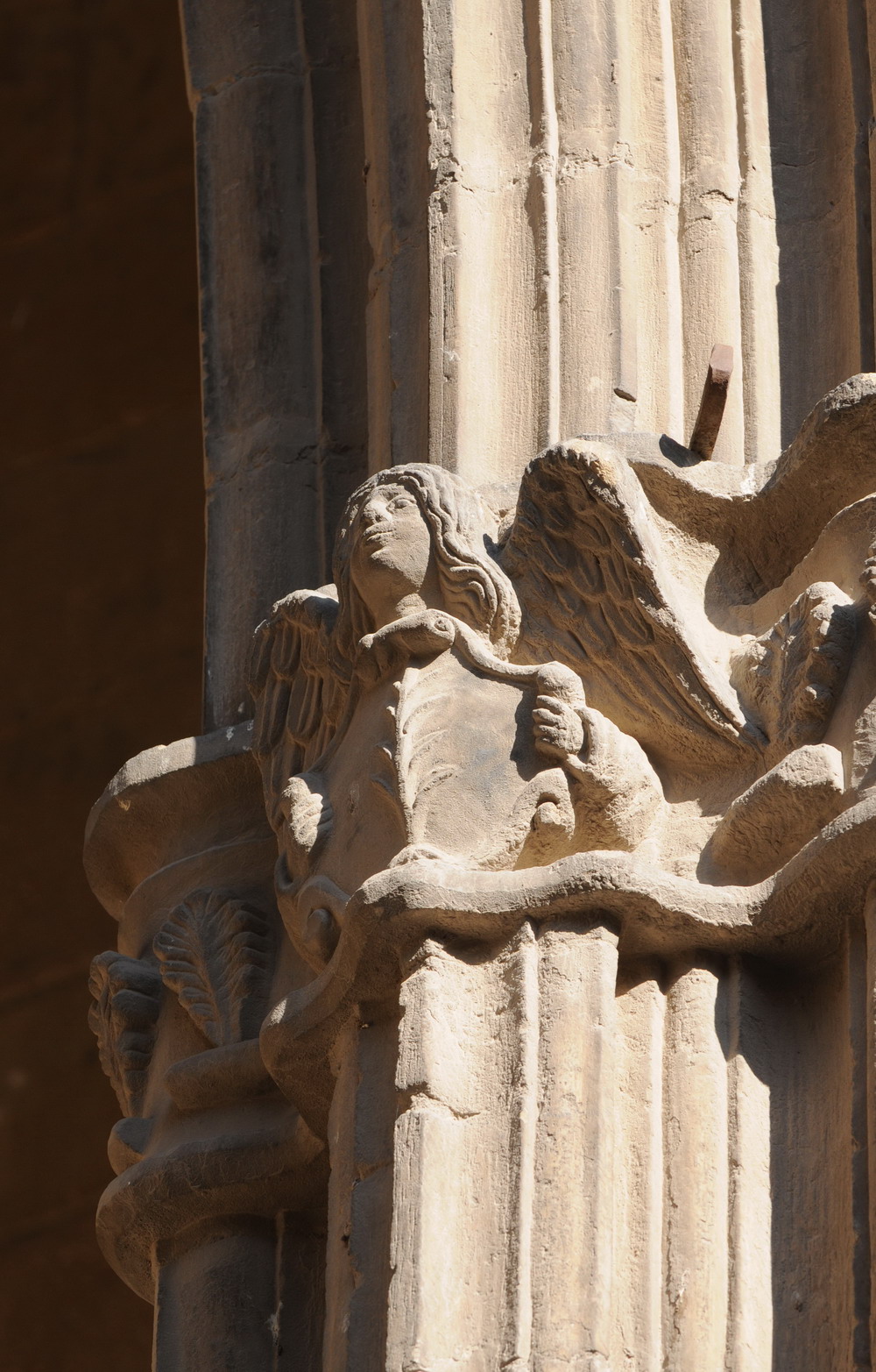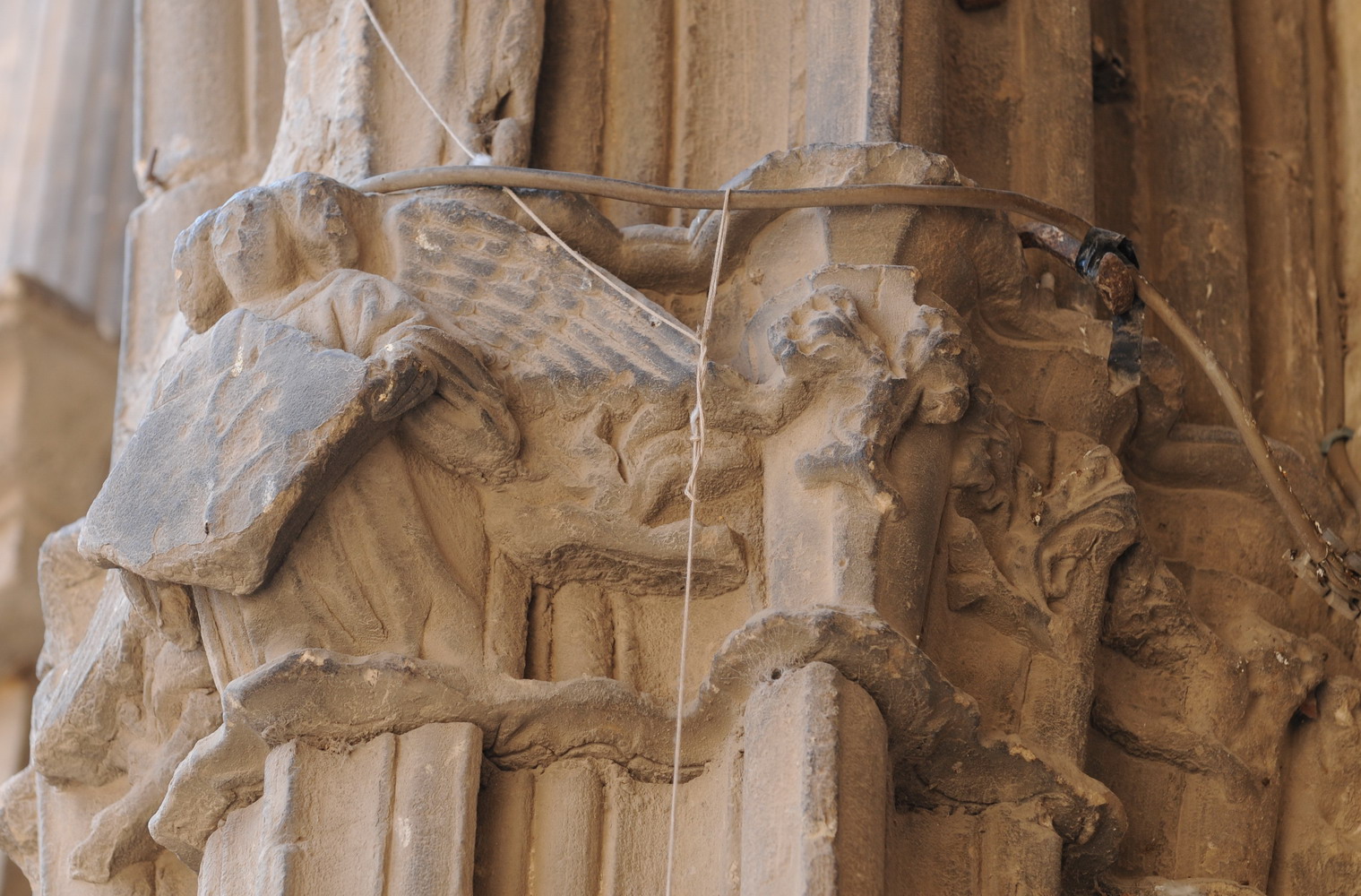 Este trabajo escultórico lógicamente está íntimamente vinculado con la propia obra que le sirve de soporte. Es evidente que la explosión, en 1840, de un polvorín en el centro de la población tuvo que producir un tremendo impacto en esta construcción, afectando en especial al tercer arco y a la zona de la esquina hacia la calle Mayor, más expuesta a la onda expansiva. Lo que pudo exigir una intervención en profundidad tan importante que incluso pudo implicar la reconstrucción de su decoración escultórica, lo que explicaría la evidente «modernidad» del ángel y los motivos vegetales aplicados al cuarto capitel, el situado en el extremo derecho de la construcción (ver imágenes 5, 6, 7 y 8).