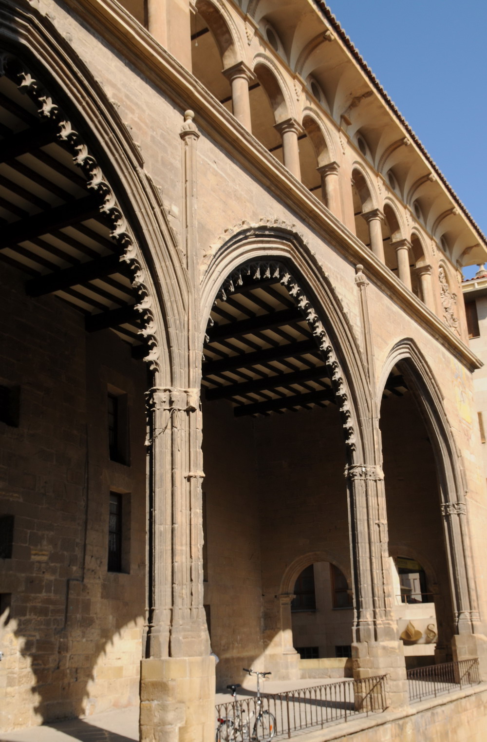 «La Lonja de Alcañiz es una de las construcciones góticas de carácter civil más importantes de las conservadas en Aragón. Su magnífico aspecto es inmediatamente reconocible por la arquería del pórtico que da paso a las dependencias del conjunto. Esta galería está formada por tres grandes arcos apuntados, si bien el tercero es el resultado de una reconstrucción emprendida después de que el edificio sufriera catastróficos defectos en su estructura tras la fatal explosión del polvorín en 1840. Los dos arcos primitivos muestran un festón de arquillos lobulados en su intradós y frondas vegetales en su trasdós. Sus capiteles están labrados con motivos escultóricos de carácter vegetal entre los que sobresale la figura de un ángel sosteniendo el escudo de la ciudad. A ellos se suma la solitaria imagen de un animal fantástico arrinconada junto a la contigua casa consistorial renacentista.