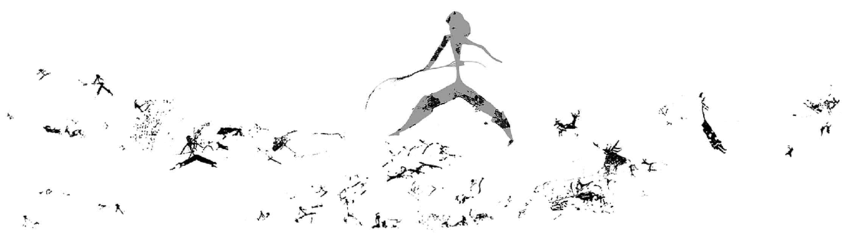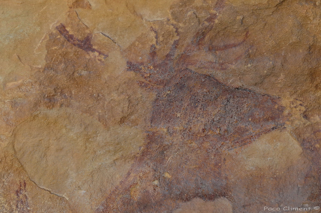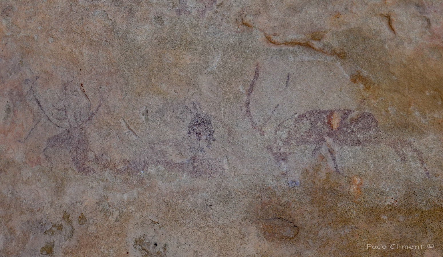 Entre las figuras representadas destaca la figura de un gran arquero con las piernas muy abiertas, con lo que se consigue trasmitir perfectamente la idea de movimiento. Dinamismo que también se refleja en las numerosas figuras de arqueros de menor tamaño con las piernas ángulo de 180 grados, captados en plena ‘carrera al vuelo’. Es curiosa la figura humana que parece portar una máscara que se enfrenta a un ciervo y que se une con la imagen de otro (en sentido contrario) con una cornamenta muy desarrollada y perfectamente conservada. Es también espectacular la figura de un gran ciervo con una soberbia cabeza coronada de una cornamenta ramificada. En ella se observa un naturalismo que se aleja del acentuado esquematismo que caracteriza a la pintura levantina. Ya en la zona derecha del friso se distingue una interesante figura femenina de gran tamaño y relativamente aislada del resto. La parte superior del cuerpo, muy estilizada, contrasta con las anchas caderas y nalgas cubiertas con una amplia falda.