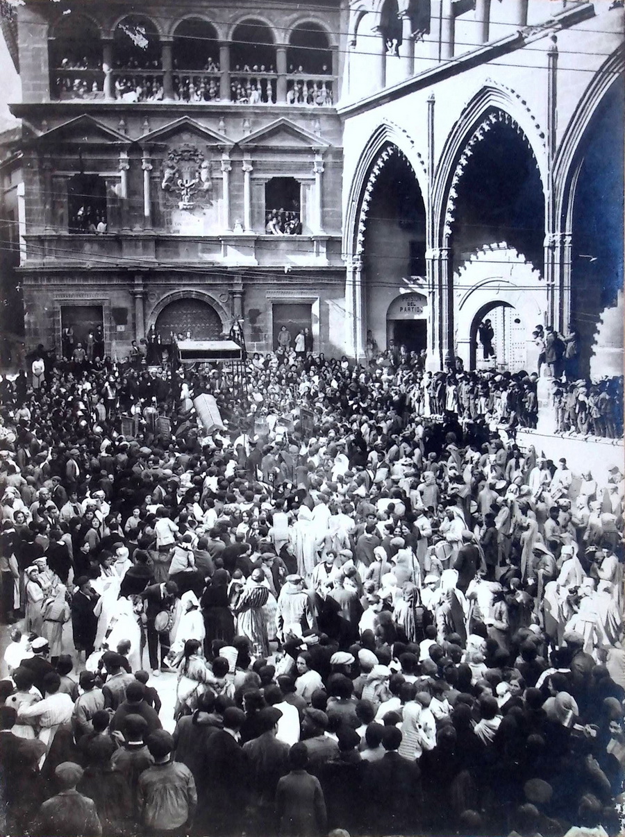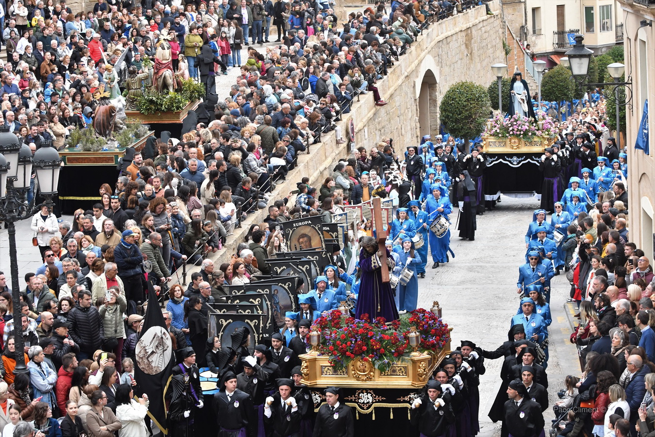 La plaza teñida de azul. El cielo también está manchado de un azul luminoso de miles de túnicas de ángeles alcañizanos que la impregnan de una magia espiritual.