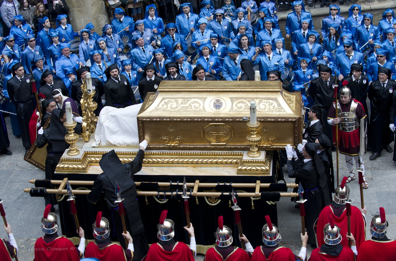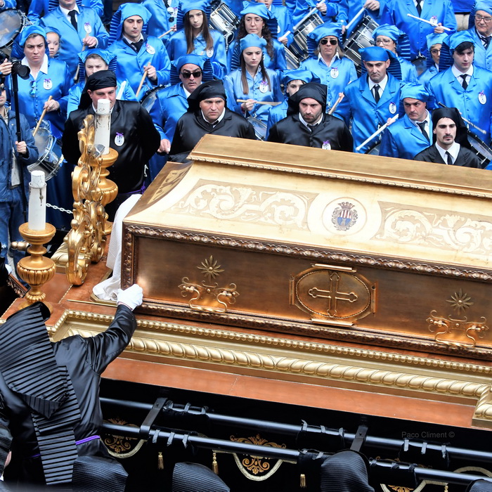 En un sepulcro dorado han depositado su cuerpo muerto, cubierto por una sábana. Rueda un tape confeccionado por las manos de los mismos portantes que cierra completamente su imagen.