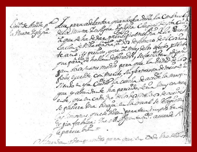 (Al margen: Limosna de azeite para la nueva yglesia.) Que para adelantar quanto sea dable la construcción de la nueva ynsigne yglesia colegial de esta ciudad a que se ha de dar principio en el día de la Purificación de Nuestra Señora, a dos de febrero del corriente año, es precisso que a más de los efectos y rentas que para /ella se hallan destinados, se faciliten y dispongan otros suaves medios para que la piedad de los fieles exercite con mérito su fervorosa devoción. Y siendo en esta ciudad la cosecha de aceite la más pingüe y abundante, ha parecido sería muy conveniente que en cada uno de los molinos de aceite se pusiera una tinaja en la qual se recogiessen las limosnas que se diessen para tan importante y pía fábrica. […]