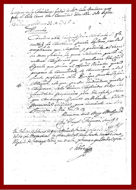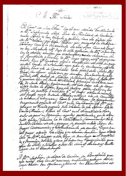 […] Haviendose visto y leido en el Ayuntamiento el memorial que ha presentado el Combento de Ntro. Padre Sn. Francisco de esta Ciudad por el que suplica licencia para hacer nueba Yglesia y extenderla segun permite el corto terreno, por la incomodidad y estrechez que padecen los fieles, con la que ay actualmente de su primera fundación […] Acordo la Ciudad y da licencia y su permiso al Combento […] en elsitio que oy la tiene […]