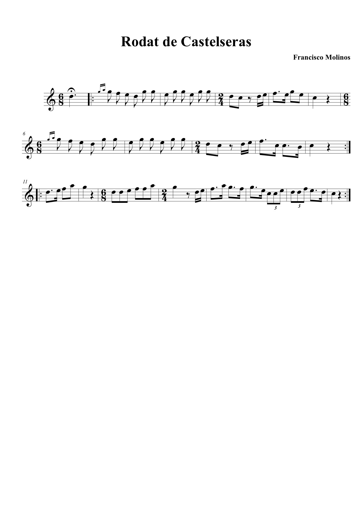Versión de la melodía del baile del rodat. Melodía del repertorio de Francisco Molinos, con transcripción y arreglo de Blas Coscollar. Publicada en: COSCOLLAR, BLAS, El libro de la dulzaina aragonesa, método y repertorio, Ayuntamiento de Zaragoza, 1987, p. 221.