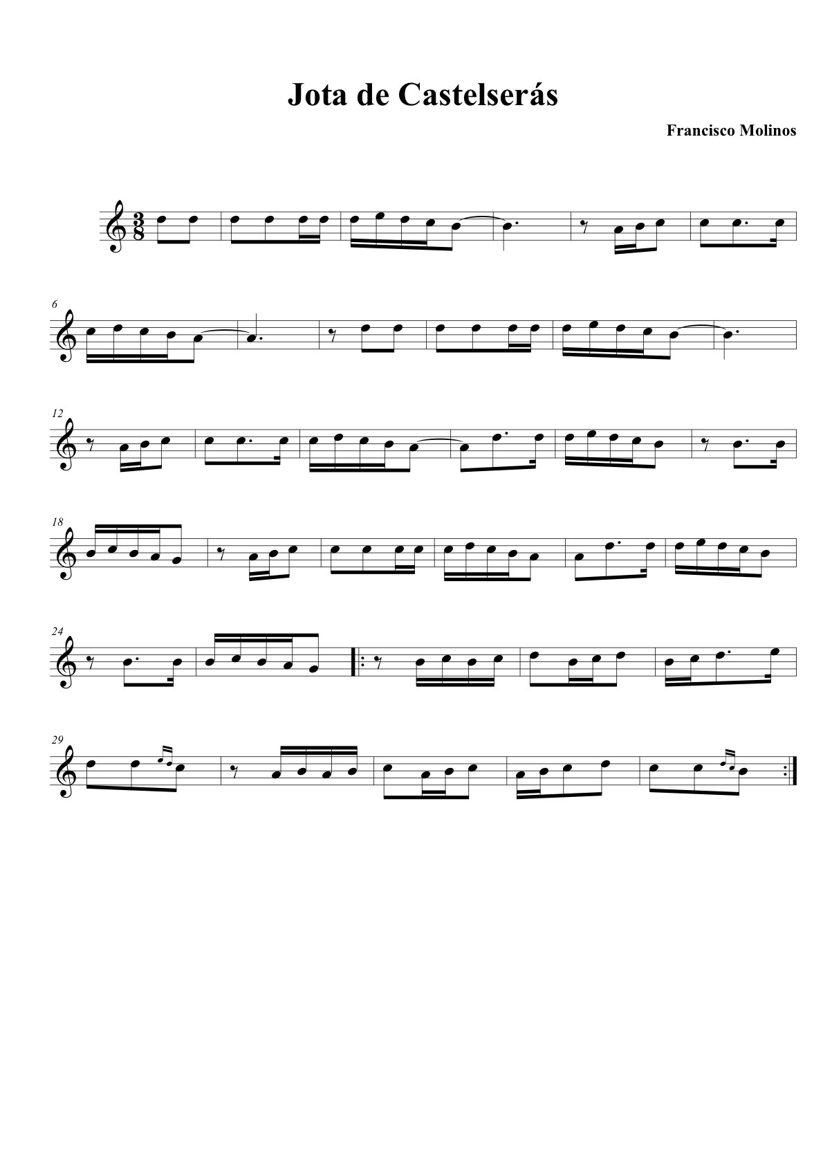 Jota del repertorio de Francisco Molinos, dulzainero de Castelserás; con transcripción y arreglo de Blas Coscollar. Publicada en: COSCOLLAR, BLAS, El libro de la dulzaina aragonesa, método y repertorio, Ayuntamiento de Zaragoza, 1987, p. 220.